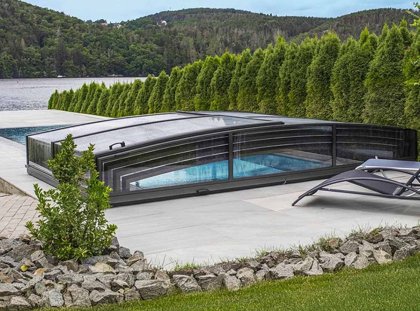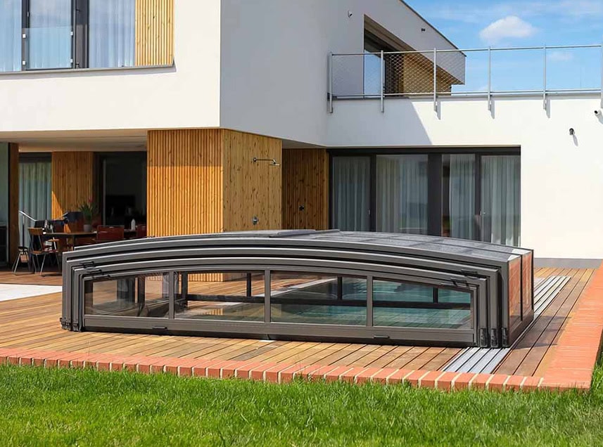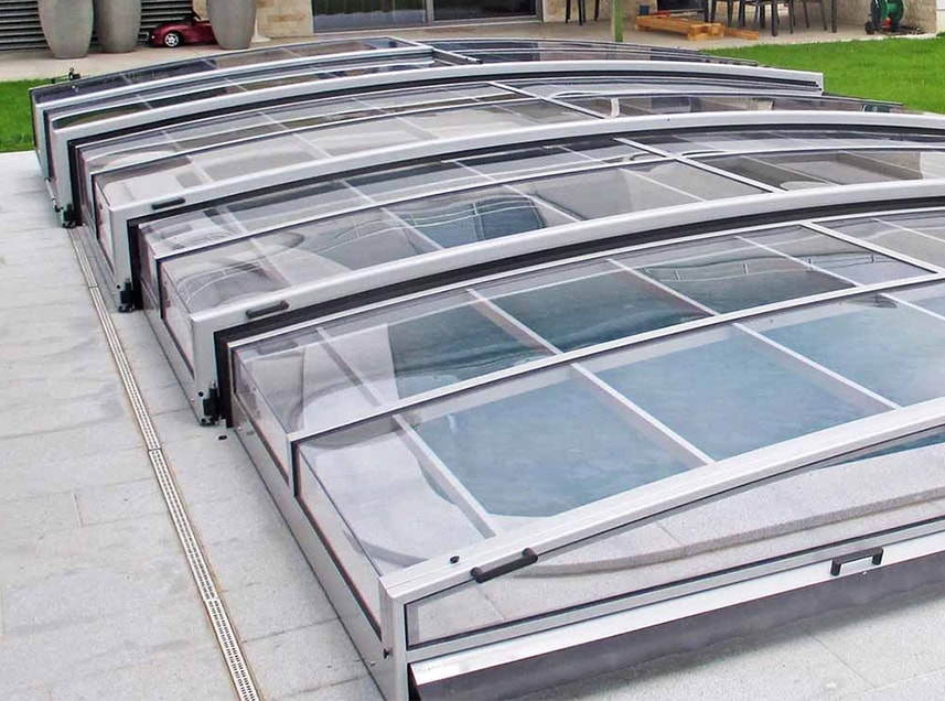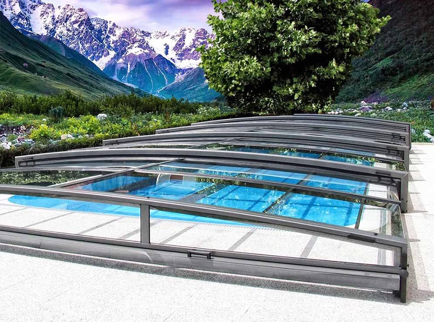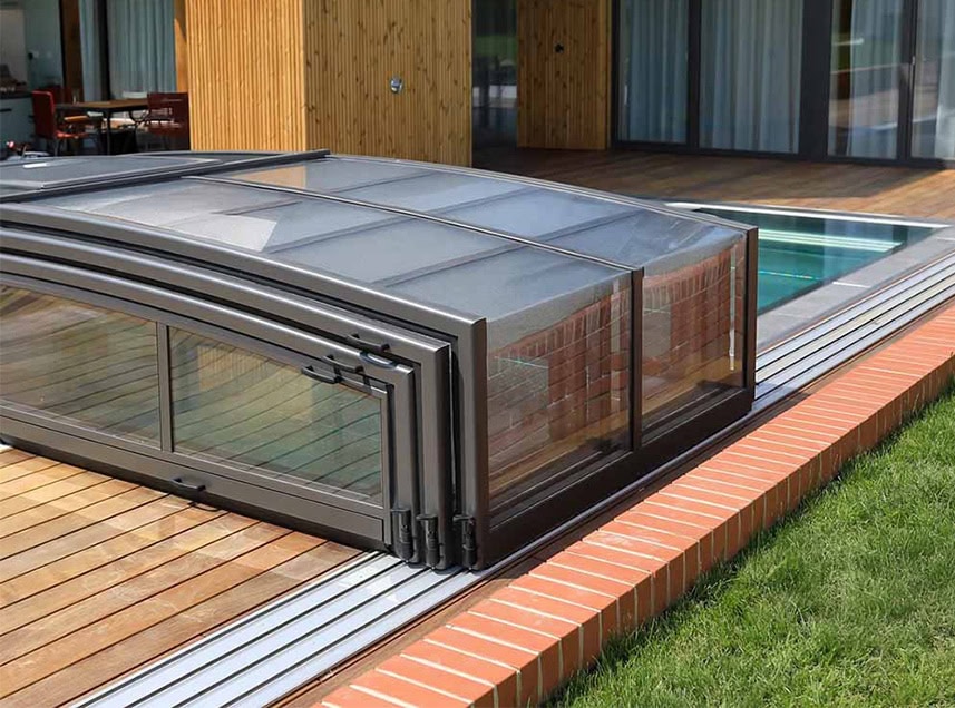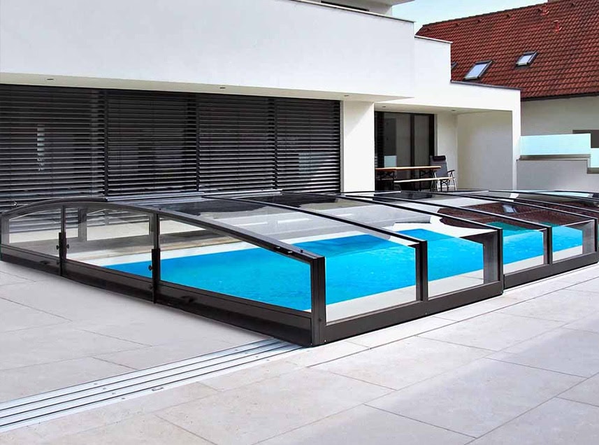 Extra lågt exklusivt pooltak med skena på en sida samt hjul på andra långsidan.